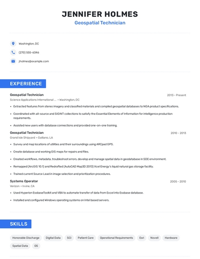 Build a professional geospatial technician resume in minutes. Browse through our resume examples to identify the best way to word your resume. Then choose from 5+ resume templates to create your geospatial technician resume.