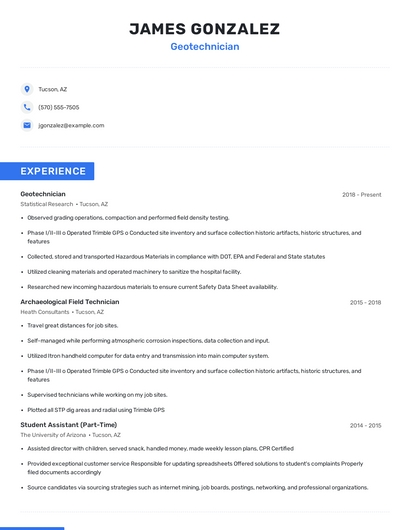 Build a professional geotechnician resume in minutes. Our AI resume writing assistant will guide you through every step of the process, and you can choose from 10+ resume templates to create your geotechnician resume.7. Petra