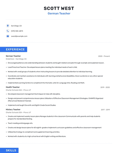 Build a professional german teacher resume in minutes. Browse through our resume examples to identify the best way to word your resume. Then choose from 5+ resume templates to create your german teacher resume.
