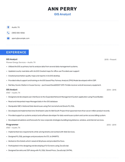 Build a professional gis analyst resume in minutes. Browse through our resume examples to identify the best way to word your resume. Then choose from 5+ resume templates to create your gis analyst resume.