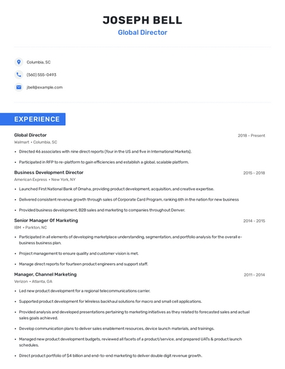 Build a professional global director resume in minutes. Browse through our resume examples to identify the best way to word your resume. Then choose from 5+ resume templates to create your global director resume.