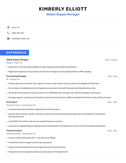 Build a professional global supply manager resume in minutes. Browse through our resume examples to identify the best way to word your resume. Then choose from 5+ resume templates to create your global supply manager resume.
