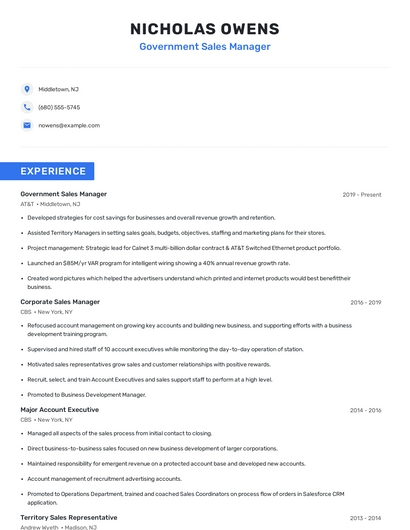 Build a professional government sales manager resume in minutes. Browse through our resume examples to identify the best way to word your resume. Then choose from 5+ resume templates to create your government sales manager resume.