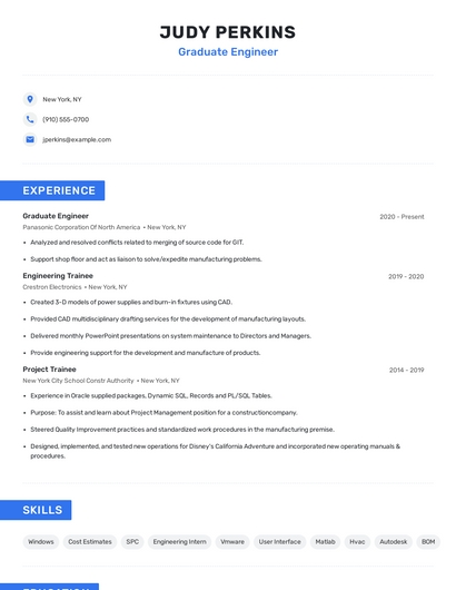 Build a professional graduate engineer resume in minutes. Browse through our resume examples to identify the best way to word your resume. Then choose from 5+ resume templates to create your graduate engineer resume.