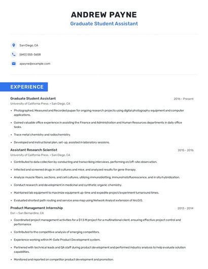 Build a professional graduate student assistant resume in minutes. Browse through our resume examples to identify the best way to word your resume. Then choose from 5+ resume templates to create your graduate student assistant resume.