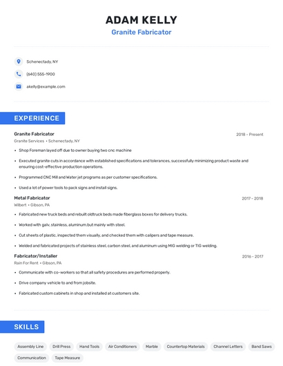 The most important skills for a granite fabricator resume and required skills for a granite fabricator to have include: