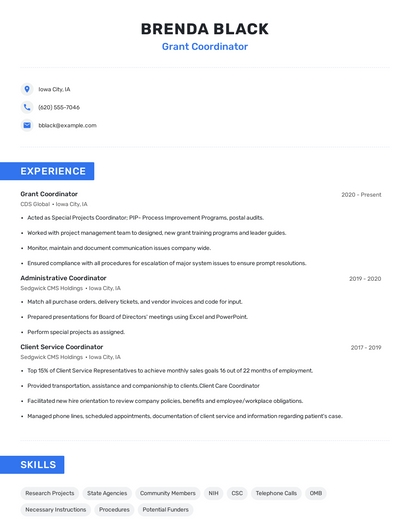 Build a professional grant coordinator resume in minutes. Browse through our resume examples to identify the best way to word your resume. Then choose from 5+ resume templates to create your grant coordinator resume.