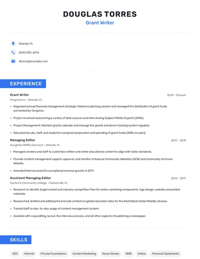 Build a professional grant writer resume in minutes. Browse through our resume examples to identify the best way to word your resume. Then choose from 5+ resume templates to create your grant writer resume.