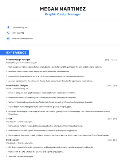 Build a professional graphic design manager resume in minutes. Browse through our resume examples to identify the best way to word your resume. Then choose from 5+ resume templates to create your graphic design manager resume.