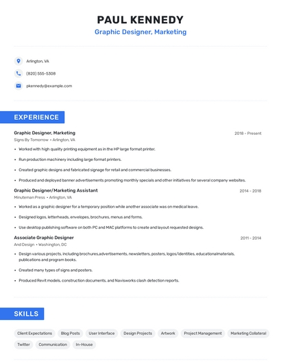 Build a professional graphic designer, marketing resume in minutes. Browse through our resume examples to identify the best way to word your resume. Then choose from 5+ resume templates to create your graphic designer, marketing resume.