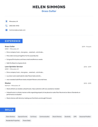 Build a professional grass cutter resume in minutes. Our AI resume writing assistant will guide you through every step of the process, and you can choose from 10+ resume templates to create your grass cutter resume.7. Flower Beds