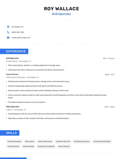 Build a professional grill operator resume in minutes. Browse through our resume examples to identify the best way to word your resume. Then choose from 5+ resume templates to create your grill operator resume.