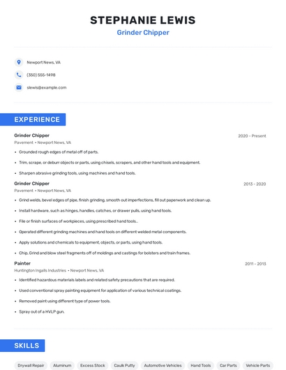 The most important skills for a grinder chipper resume and required skills for a grinder chipper to have include: