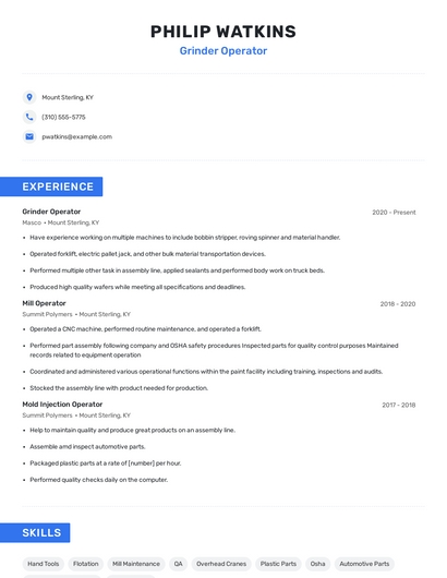 Build a professional grinder operator resume in minutes. Browse through our resume examples to identify the best way to word your resume. Then choose from 5+ resume templates to create your grinder operator resume.
