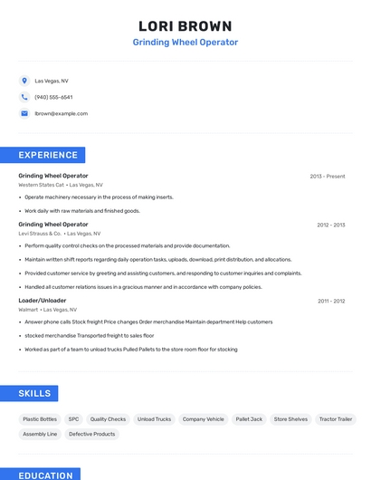 The most important skills for a grinding wheel operator resume and required skills for a grinding wheel operator to have include: