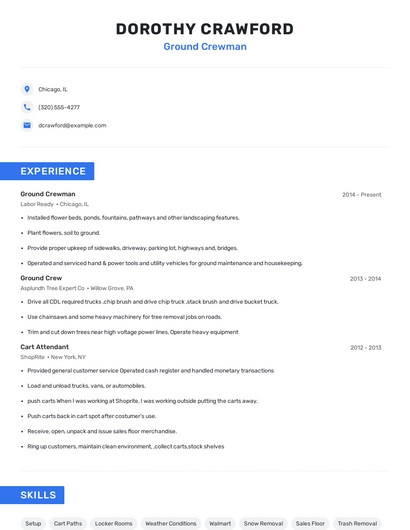 Build a professional ground crewman resume in minutes. Our AI resume writing assistant will guide you through every step of the process, and you can choose from 10+ resume templates to create your ground crewman resume.7. Shovels