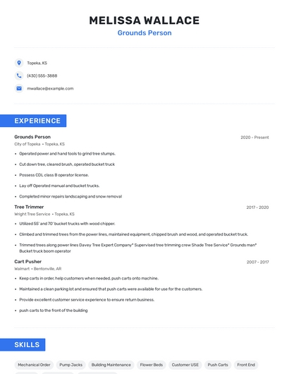 Build a professional grounds person resume in minutes. Browse through our resume examples to identify the best way to word your resume. Then choose from 5+ resume templates to create your grounds person resume.