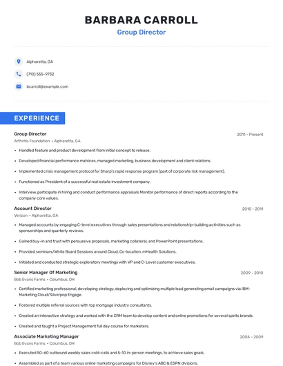 Build a professional group director resume in minutes. Browse through our resume examples to identify the best way to word your resume. Then choose from 5+ resume templates to create your group director resume.