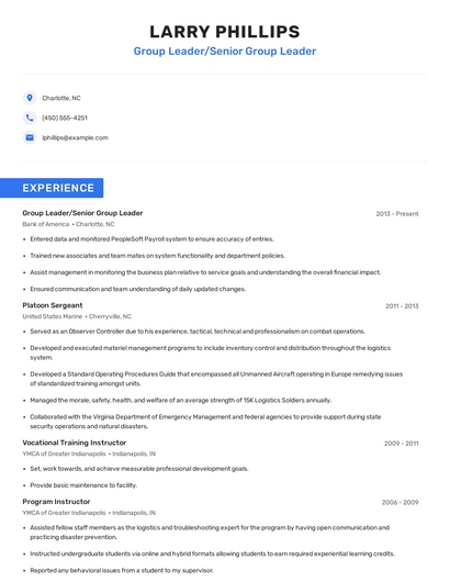 Build a professional group leader/senior group leader resume in minutes. Browse through our resume examples to identify the best way to word your resume. Then choose from 5+ resume templates to create your group leader/senior group leader resume.