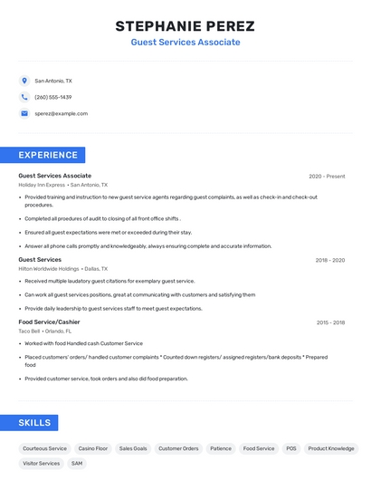 Build a professional guest services associate resume in minutes. Our AI resume writing assistant will guide you through every step of the process, and you can choose from 10+ resume templates to create your guest services associate resume.7. Excellent Guest