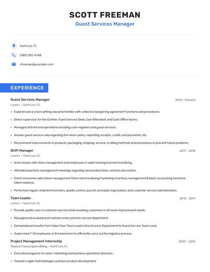 Build a professional guest services manager resume in minutes. Browse through our resume examples to identify the best way to word your resume. Then choose from 5+ resume templates to create your guest services manager resume.