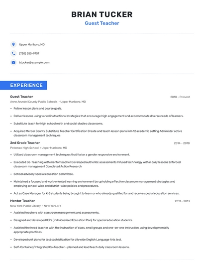 Build a professional guest teacher resume in minutes. Browse through our resume examples to identify the best way to word your resume. Then choose from 5+ resume templates to create your guest teacher resume.