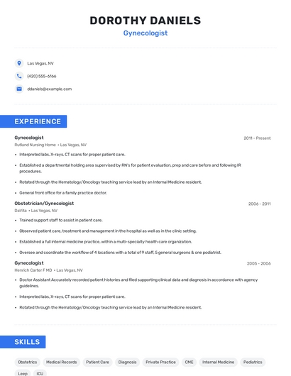 Build a professional gynecologist resume in minutes. Browse through our resume examples to identify the best way to word your resume. Then choose from 5+ resume templates to create your gynecologist resume.