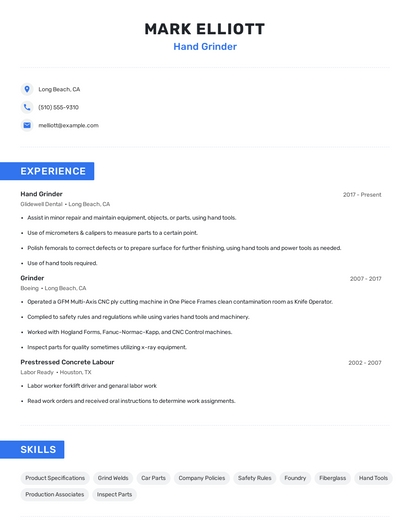 Build a professional hand grinder resume in minutes. Browse through our resume examples to identify the best way to word your resume. Then choose from 5+ resume templates to create your hand grinder resume.