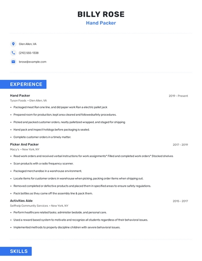 Build a professional hand packer resume in minutes. Browse through our resume examples to identify the best way to word your resume. Then choose from 5+ resume templates to create your hand packer resume.