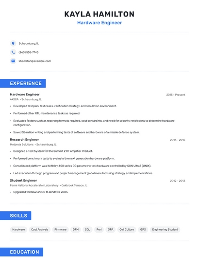 Build a professional hardware engineer resume in minutes. Browse through our resume examples to identify the best way to word your resume. Then choose from 5+ resume templates to create your hardware engineer resume.