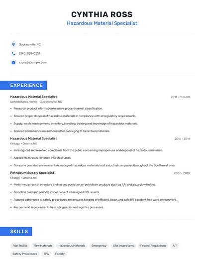 Build a professional hazardous material specialist resume in minutes. Browse through our resume examples to identify the best way to word your resume. Then choose from 5+ resume templates to create your hazardous material specialist resume.
