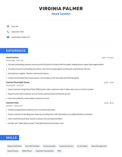Build a professional head cashier resume in minutes. Browse through our resume examples to identify the best way to word your resume. Then choose from 5+ resume templates to create your head cashier resume.