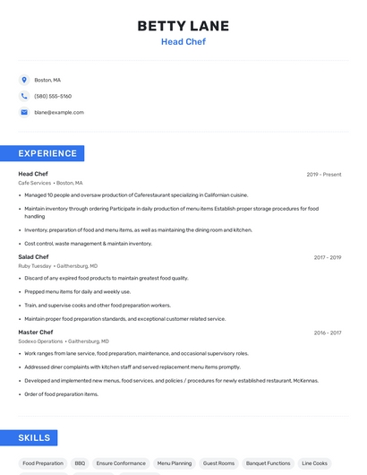 Build a professional head chef resume in minutes. Browse through our resume examples to identify the best way to word your resume. Then choose from 5+ resume templates to create your head chef resume.