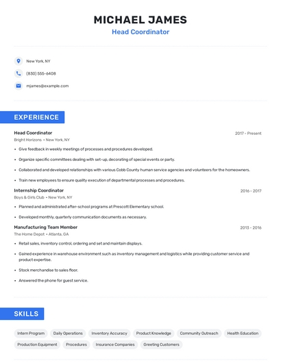 Build a professional head coordinator resume in minutes. Browse through our resume examples to identify the best way to word your resume. Then choose from 5+ resume templates to create your head coordinator resume.