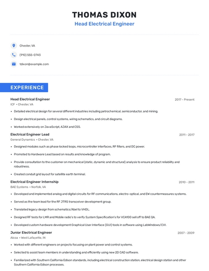 Build a professional head electrical engineer resume in minutes. Browse through our resume examples to identify the best way to word your resume. Then choose from 5+ resume templates to create your head electrical engineer resume.