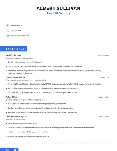 Build a professional head of security resume in minutes. Browse through our resume examples to identify the best way to word your resume. Then choose from 5+ resume templates to create your head of security resume.