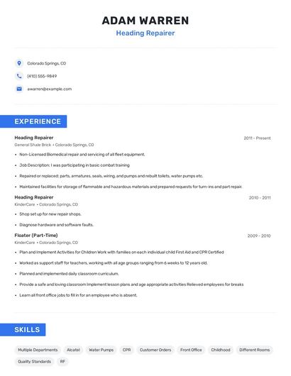 Build a professional heading repairer resume in minutes. Our AI resume writing assistant will guide you through every step of the process, and you can choose from 10+ resume templates to create your heading repairer resume.7. Cellphone
