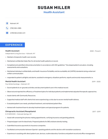 Build a professional health assistant resume in minutes. Browse through our resume examples to identify the best way to word your resume. Then choose from 5+ resume templates to create your health assistant resume.