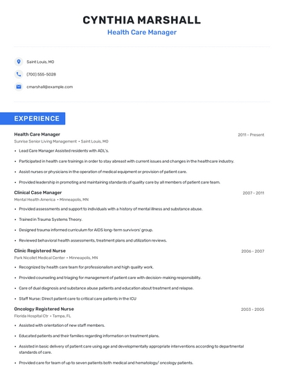 Build a professional health care manager resume in minutes. Browse through our resume examples to identify the best way to word your resume. Then choose from 5+ resume templates to create your health care manager resume.