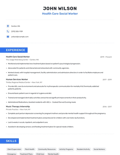 Build a professional health care social worker resume in minutes. Browse through our resume examples to identify the best way to word your resume. Then choose from 5+ resume templates to create your health care social worker resume.