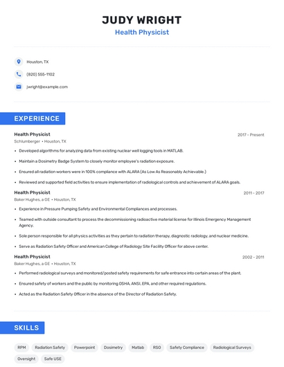 Build a professional health physicist resume in minutes. Browse through our resume examples to identify the best way to word your resume. Then choose from 5+ resume templates to create your health physicist resume.