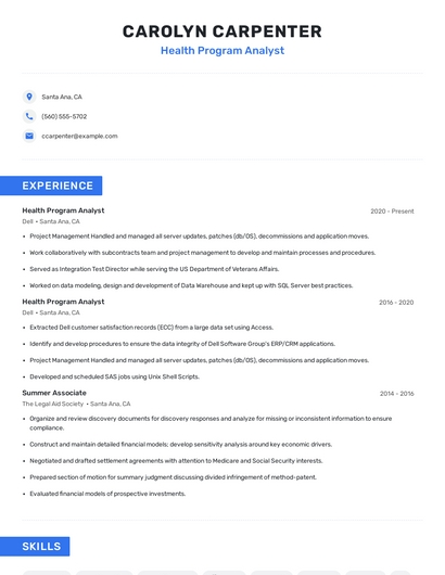Build a professional health program analyst resume in minutes. Browse through our resume examples to identify the best way to word your resume. Then choose from 5+ resume templates to create your health program analyst resume.