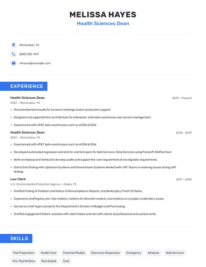 Build a professional health sciences dean resume in minutes. Browse through our resume examples to identify the best way to word your resume. Then choose from 5+ resume templates to create your health sciences dean resume.