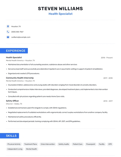 Build a professional health specialist resume in minutes. Browse through our resume examples to identify the best way to word your resume. Then choose from 5+ resume templates to create your health specialist resume.
