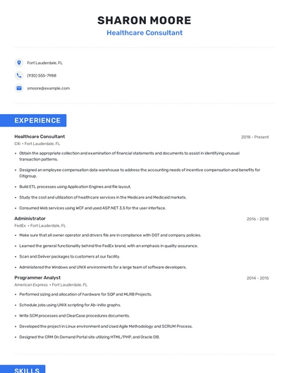 Build a professional healthcare consultant resume in minutes. Browse through our resume examples to identify the best way to word your resume. Then choose from 5+ resume templates to create your healthcare consultant resume.