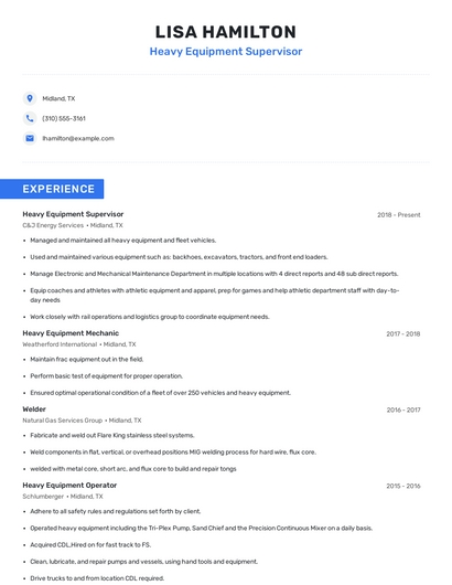 Build a professional heavy equipment supervisor resume in minutes. Browse through our resume examples to identify the best way to word your resume. Then choose from 5+ resume templates to create your heavy equipment supervisor resume.