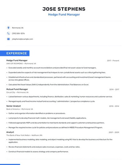 Build a professional hedge fund manager resume in minutes. Browse through our resume examples to identify the best way to word your resume. Then choose from 5+ resume templates to create your hedge fund manager resume.