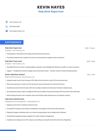Build a professional help desk supervisor resume in minutes. Browse through our resume examples to identify the best way to word your resume. Then choose from 5+ resume templates to create your help desk supervisor resume.