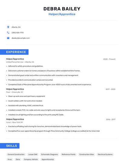Build a professional helper/apprentice resume in minutes. Browse through our resume examples to identify the best way to word your resume. Then choose from 5+ resume templates to create your helper/apprentice resume.