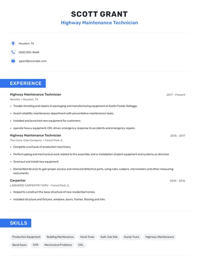 Build a professional highway maintenance technician resume in minutes. Browse through our resume examples to identify the best way to word your resume. Then choose from 5+ resume templates to create your highway maintenance technician resume.